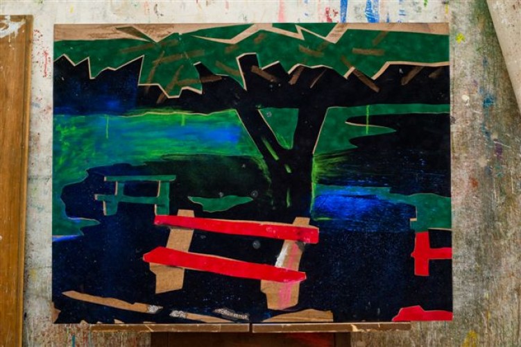 Legújabb képein hűlő helyükön festi meg a lélek ott felejtett nyomait Ádám Zoltán: kerti padokon hagyott feszültségeket, szerelmi tüzek parazsát. Az olykor műanyag díszítőelemeket kristályként a képre applikáló, máskor papírragasztásos megoldással dolgozó Ádám a szegény művészetre oly jellemzően néha talmi deszkákra készíti képeit.