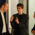 És persze ugyanezeket a kérdéseket visszatranszponálhatjuk a festményekbe is: mi a különbség a kései Árpád-korban bevezetett nyolc sávos vörös-fehér felségjel és a vele megtévesztésig azonosnak tűnő kortárs politikai címke között? Mi a különbség a sajtófotóvá stilizált asszonykórus lába alól előtörő barna megfolyás és a hokedlin parádézó közlekedési rendőr kabátjának színe között? Mi a különbség az Ígéret című képen megjelenő bohóc riasztó ágálása és a politikai hatos ikrek ugrócsoportja által bemutatott kunszt között? Mi a különbség a Hímzésre vetődő ebek hullahopp karikás produkciója és a Fényreklám párducainak acsarkodása között?