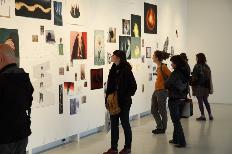 Látjuk még a periférián a színes grafikonokat, kitakarják őket a képek, szinte nem is látszanak. Olyan a fal így, mint egy kórházi lázlap, több színes, szabálytalan EKG-csík. Ahol a képek alatt eltűnnek a vonalak, ott a hiány van, nincs élet. Illetve, ha másként nézzük, épp ott látunk bele az életbe, ahol a vonal megszűnik, ott tárul ki egy metaforányi ablak, amin keresztül beleshetünk a dobozba. Nem is doboz teteje ez, hanem egy csapóajtó, amely egy pillanatra felnyílik, és egy rövid időre láthatóvá válnak a fogaskerekek, a hajógépezet, aztán visszacsukódik minden, az életvonal folytatódik.